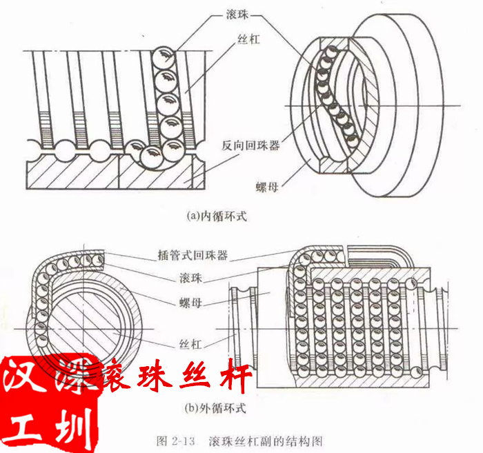 圖2—3為滾珠絲杠副的結構原理圖。工作時,螺母4與需作直線往復運動的零部件相連,絲杠1旋轉帶動螺母4作直線往復運動,從而帶動零部件作直線往復運動。在絲杠1、螺母4和端蓋2(滾珠循環裝置)上都制有螺旋槽,由這些槽對合起來形成滾珠循環通道,滾珠3在此通道內循環滾動。為了防止滾珠3從螺母中掉出,螺母螺旋槽的兩端應封住。